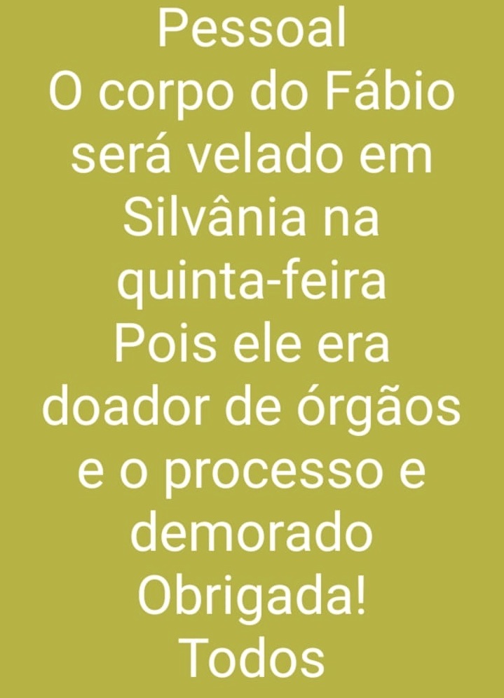 “Faleceu no início da noite desta terça-feira, 29/10/2019, no Hospital de Urgências de Goiânia, onde encontrava-se, internado, o Silvaniense Fábio Vieira dos Santos, aos 38 anos, vítima de acidente automobilístico ocorrido na Rodovia Senador José Caixeta do Nascimento GO-010, no início da noite do último sábado, 26.