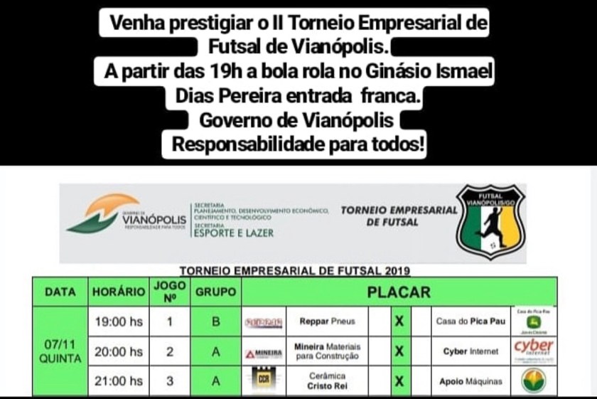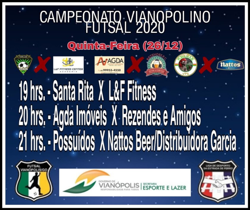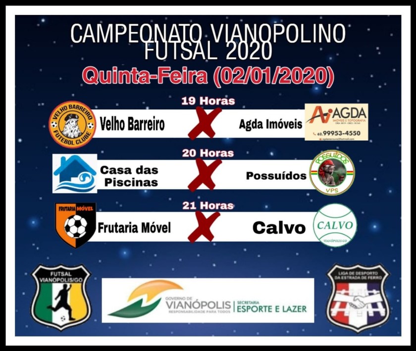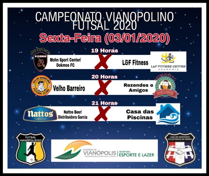 Hoje tem rodada do futsal em Vianópolis, hoje tem continuação do campeonato Vianopolino de futsal 2020 que começou no final de dezembro, portanto a bola rola no ginásio Ismael Dias Pereira !!!