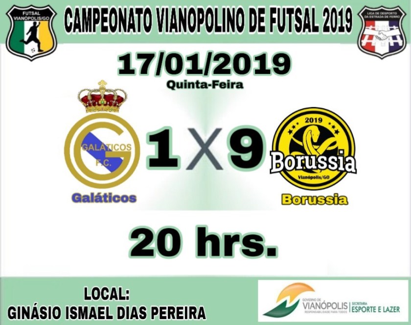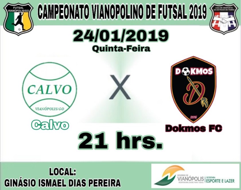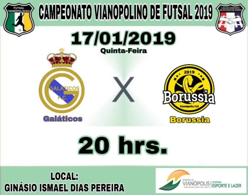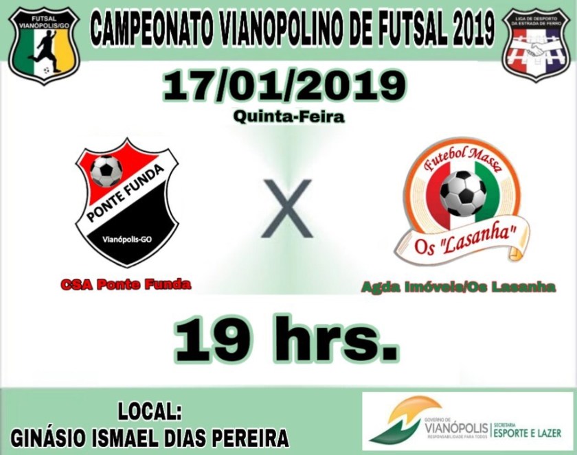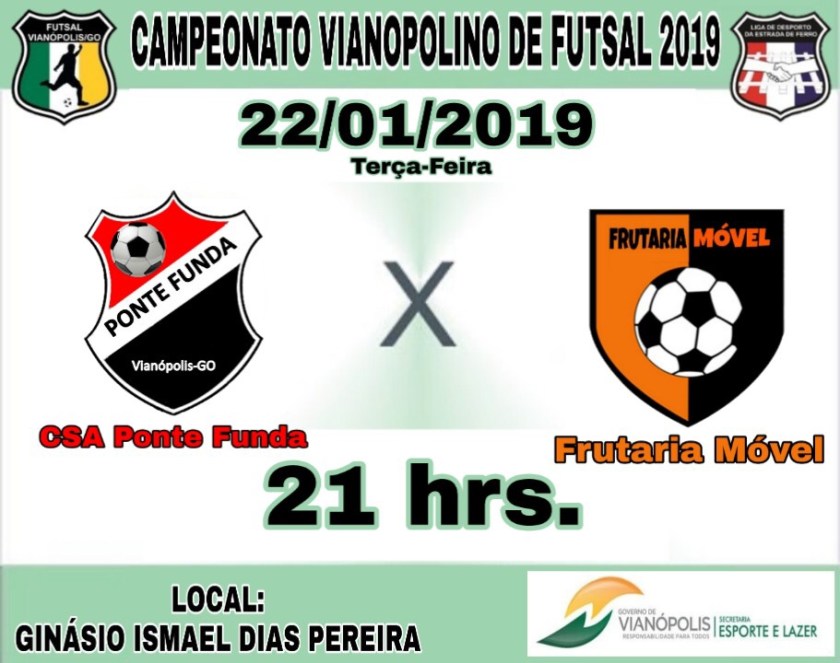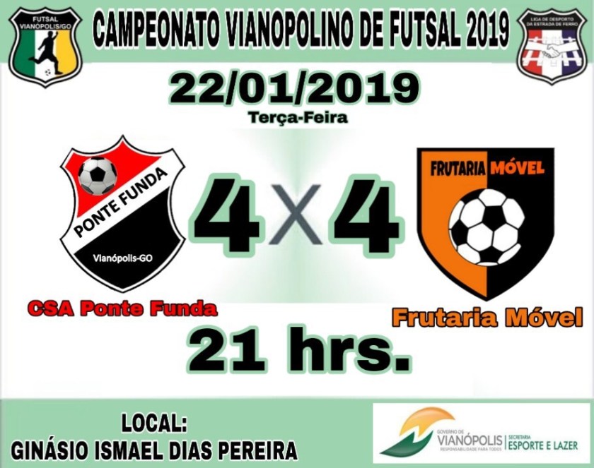 Hoje segunda-feira 21-01-2019 tem início a 4ª Rodada do campeonato Vianopolino de Futsal 2019, Campeonato organizado pela Secretaria Municipal de Esportes e lazer de Vianópolis, jogos realizados no ginásio Ismael Dias Pereira.