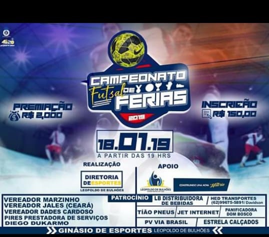 Com início na noite de hoje sexta-feira 18-01-2019 o Campeonato Municipal de Futsal de Leopoldo de Bulhões 2019, com a reinauguração do Ginásio de Esportes local, a Organização do campeonato e por Conta da Diretoria de Esportes de Leopoldo de Bulhões.